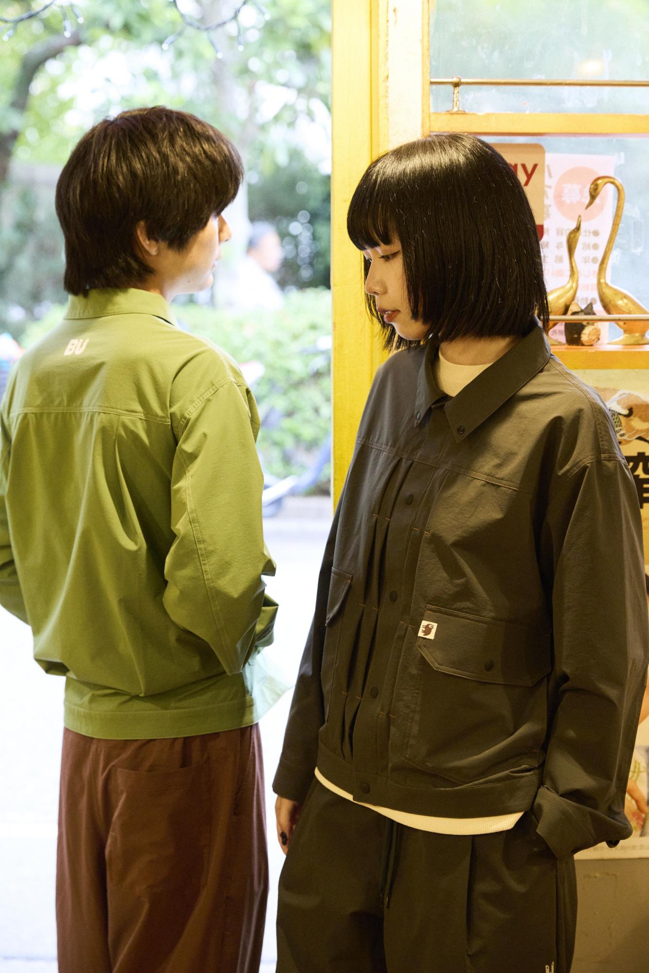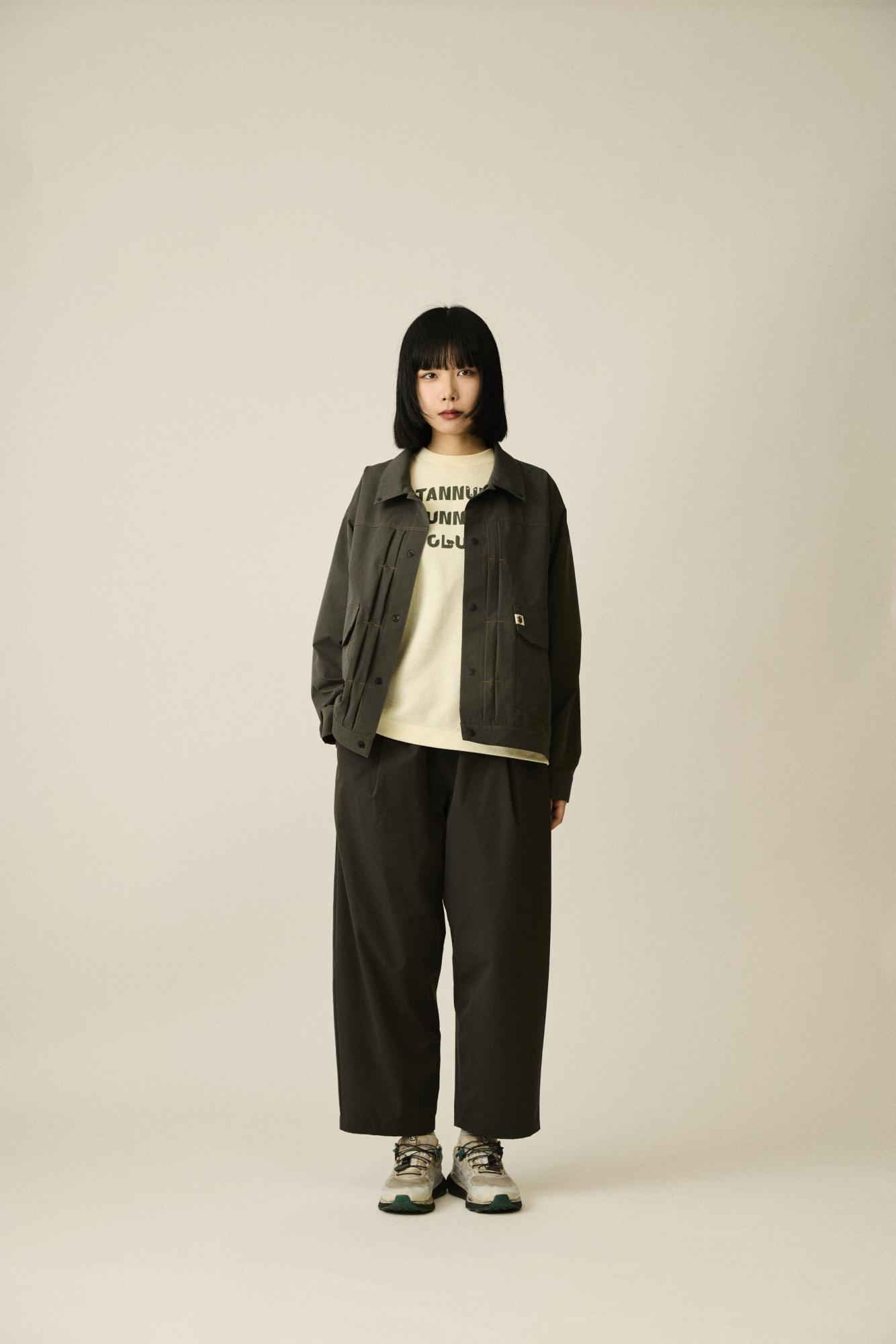 程よいフィット感と短めの丈を組み合わせています。フロントのステッチとひだ状の仕様がデザインのポイントとなっています。上からもサイドからも手を入れることができる大きめのポケットが左右に配置されています。フロントはスナップ仕様で開け閉めすることでベンチレーションとして機能します。襟先にもスナップが付いており、襟をたてた状態でのおさまりを良くしています。バックサイドにはタックを付け、可動域を広げ、また形状によってはランニングザックの上からでも羽織ることが出来るようになっています。